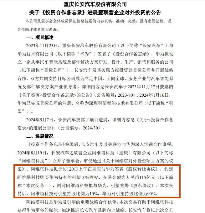 2023年11月25日,长安汽车与华为签署《投资合作备忘录》,华为拟设立一家从事汽车智能系统及部件解决方案研发、设计、生产、销售和服务的新公司。双方原定于半年内签署最终交易文件,包括股权购买协议、股东协议、目标公司章程等,长安汽车以及关联方的持股比例不超过40%。今年初,华为完成目标公司的注册,名称为深圳引望智能技术有限公司,业务范围主要包括汽车智能驾驶解决方案、汽车智能座舱、智能汽车数字平台等。