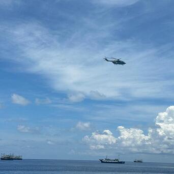 但是吧,菲船刚刚抵达就被我方包围了。此值守的中菲海警5103舰及大批钢质渔船迅速行动,对这三艘菲律宾渔政船来了个迂回包抄。另外两艘中方巡逻艇则赶至沙洲附近,以防止菲船员非法登滩。随即,一架直8直升机也飞抵菲船上空盘旋震慑。
