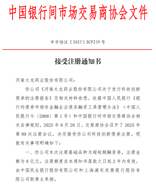 【大河财立方消息】中国银行间市场交易商协会日前批复陕西配资平台,接受河南太龙药业股份有限公司超短期融资券注册,注册金额为8亿元,注册额度自2025年9月2日起2年内有效,由民生银行和浦发银行联席主承销。